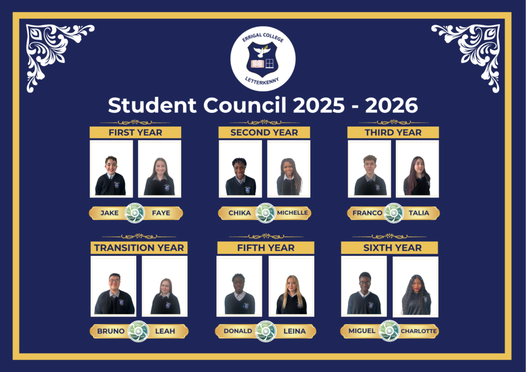 Student council meetings take place on the above mentioned dates. The Student Council meet regularly with the Student Voice Coordinator (Mr. Evan Gorrell), Principal (Mr. Danny McFadden) and Deputy Principal (Ms. Deirdre Markham), and with the Board of Management annually.